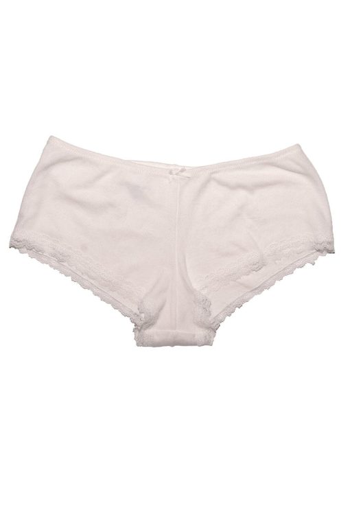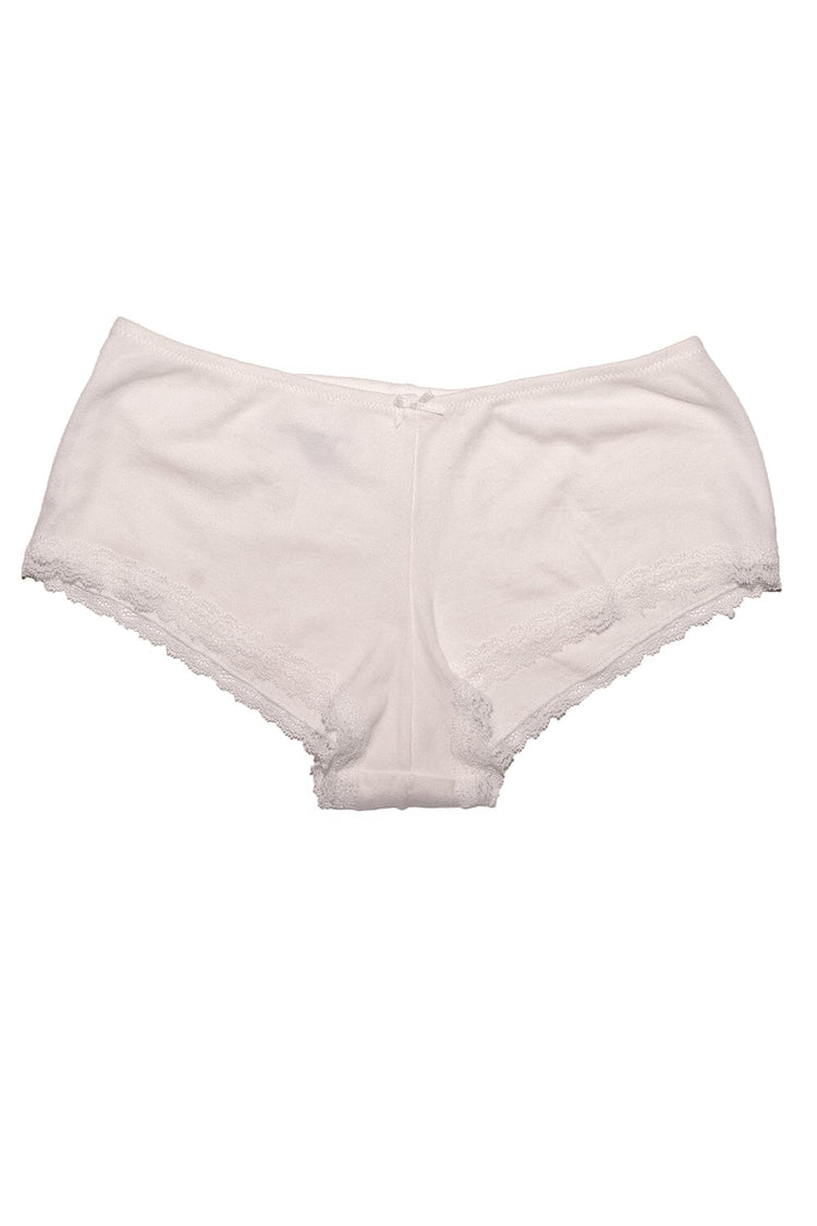 Soft cotton 'boyshort' style undies with a lace trim and bow details.All intimates are final sale.Fabrics: 95% cotton 5% elastaneMeasurement: 4″ (10cm) rise, 20″ (51cm)waist (stretches)Made in: Italy
