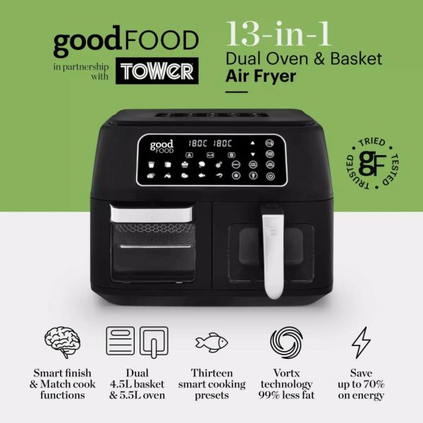Good Food Litre Oven And Basket Air Fryer Black | Air Fryers/Kitchen Tower Housewares Dual Basket Air Fryers